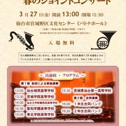 3月27日(金)宮城野区文化センターで開催された、「第14回 吹奏楽・春のジョイントコンサート」に出演しました。 本校は、プログラム3番に出演しました。 【単独演奏】栄光の架橋、さくら、3つの琉球民謡、 僕らまた 【1年合同バンド】マーチ「ライヴリーアヴェニュー」、学園天国 【アンサンブル】ミッキーマウス・マーチ 【2年合同バンド】あつまれ ...