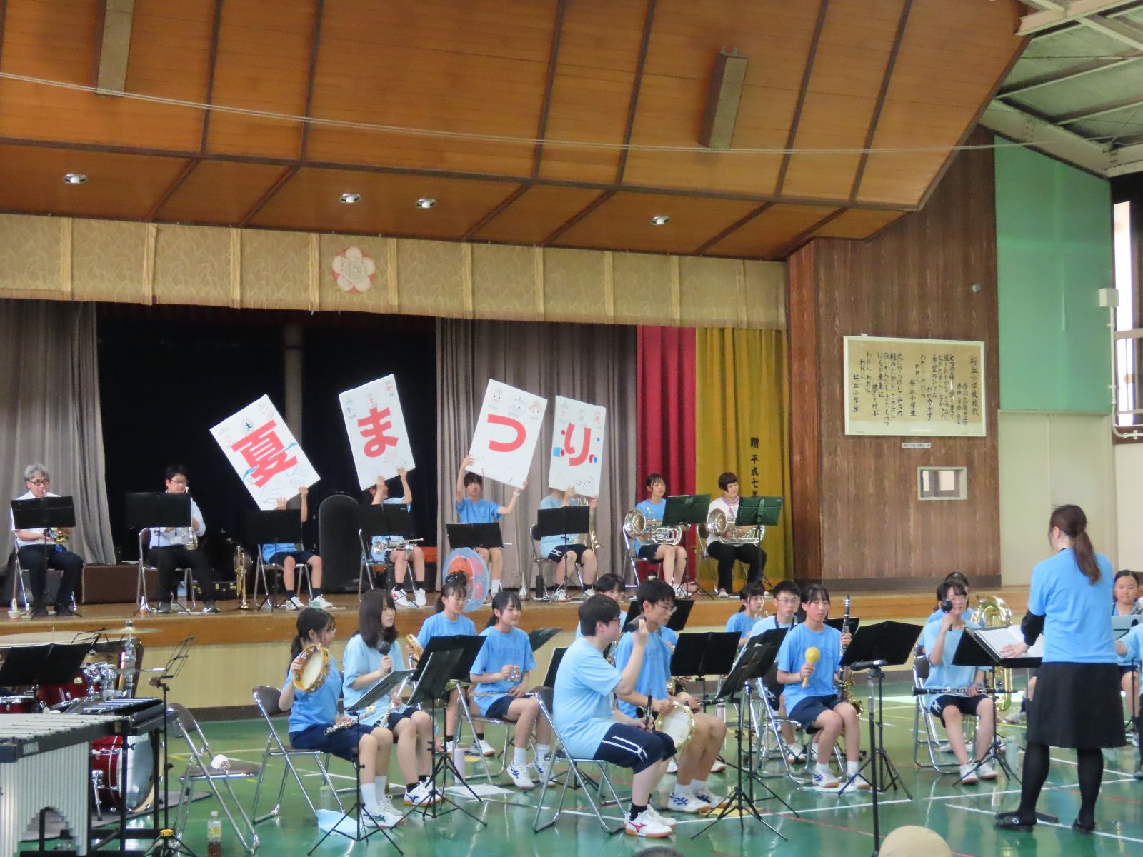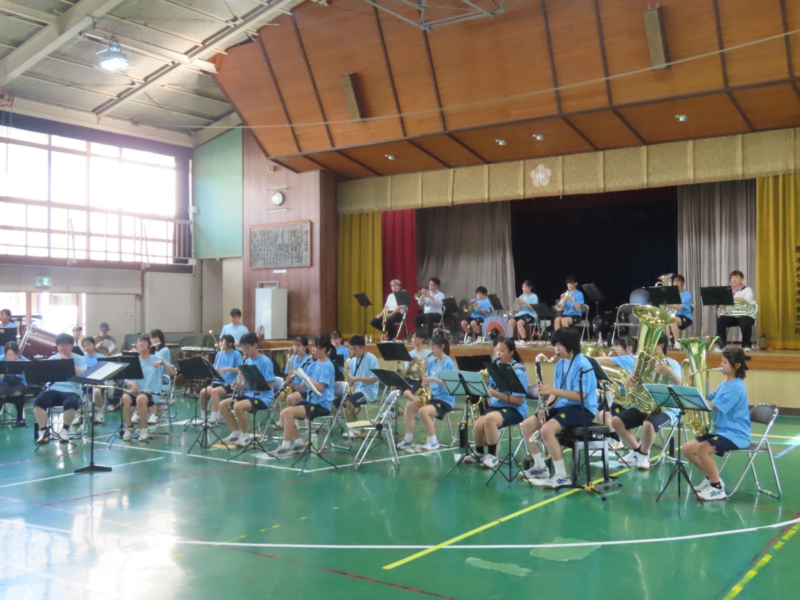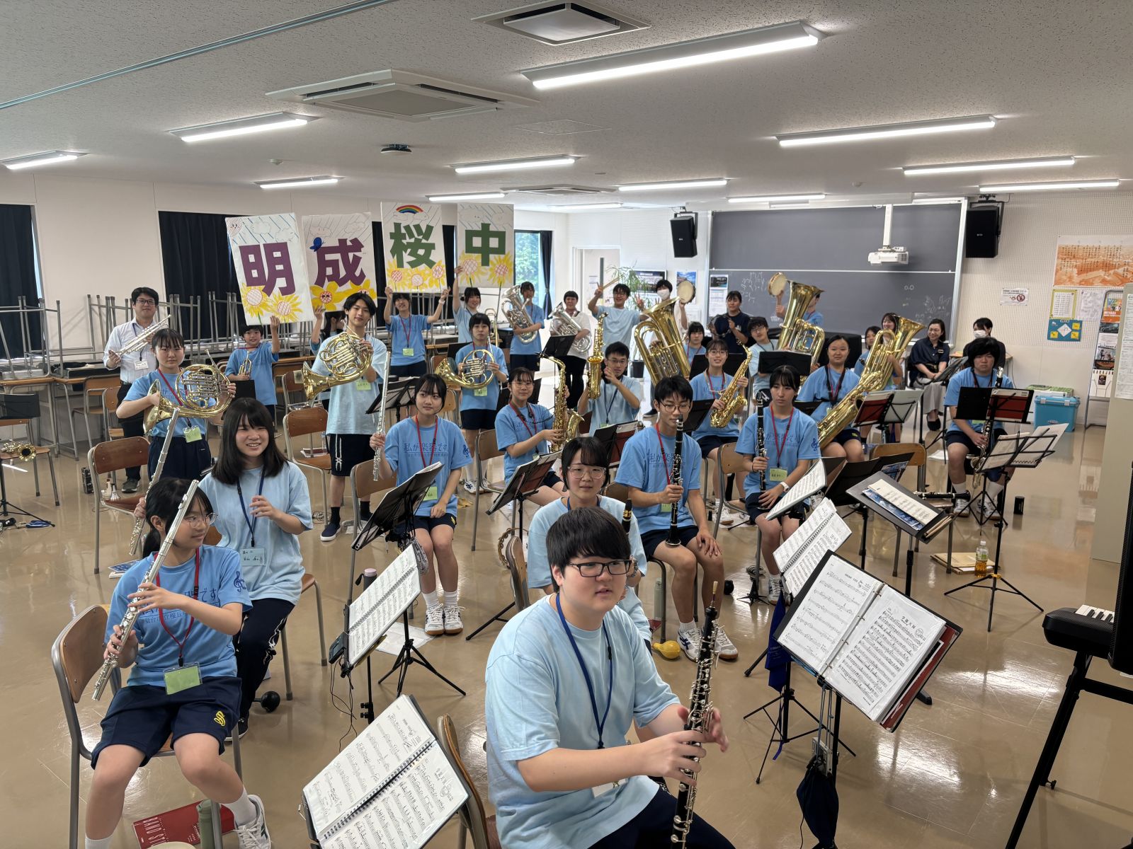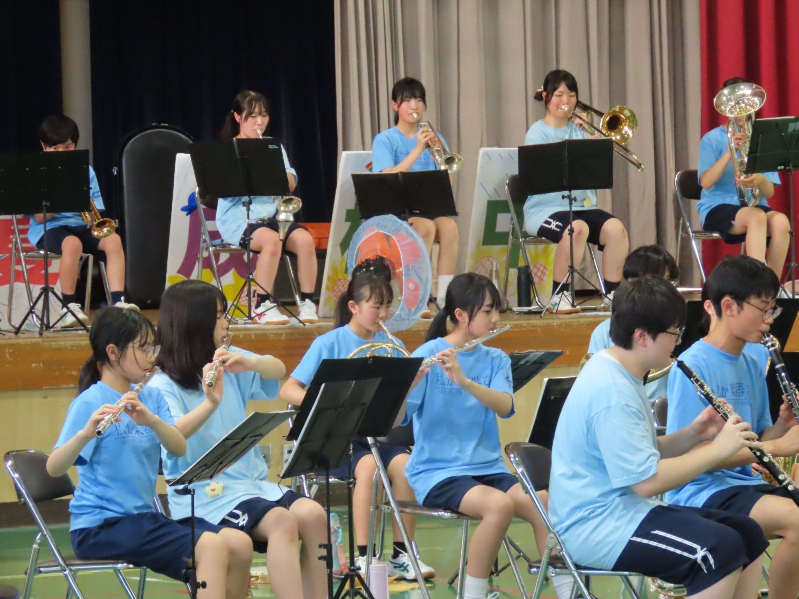 8/23(土)地域の最大行事である「桜ヶ丘夏祭り」に出演しました。仙台市内の最高気温36℃の猛暑でしたが、町内会や保護者の皆様方の絶大な協力を頂きながら、楽しく演奏できました。(写真は、当日午前中の練習の様子)今年は、地元の桜丘中吹奏楽部と『夏祭りスペシャル吹奏楽団』を結成し、楽しく準備練習を進めてきました。第1部は各校の演奏、第2部は「マツケンサンバⅡ」「オレンジ」「津軽海峡冬景色」「学園天国」を合同演奏しました。
