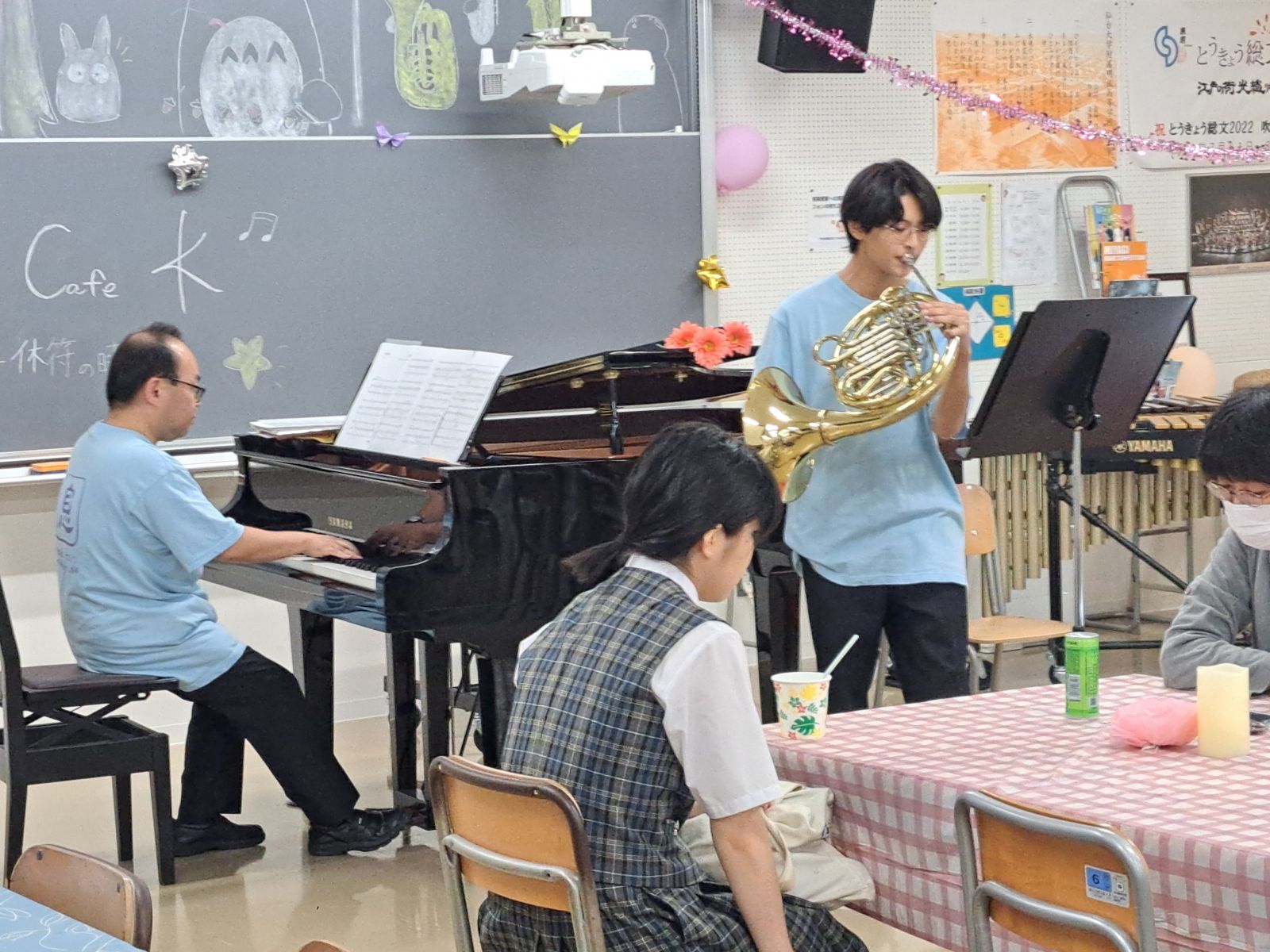 部員によるソロ・アンサンブル演奏が楽しめる音楽喫茶店「Concert Café K~休符の時間」は、創部以来初の試みとして開店(運営&演奏)しました。予想をはるかに上回る来店者数を数え、用意していたジュース・茶菓も完売となりました。