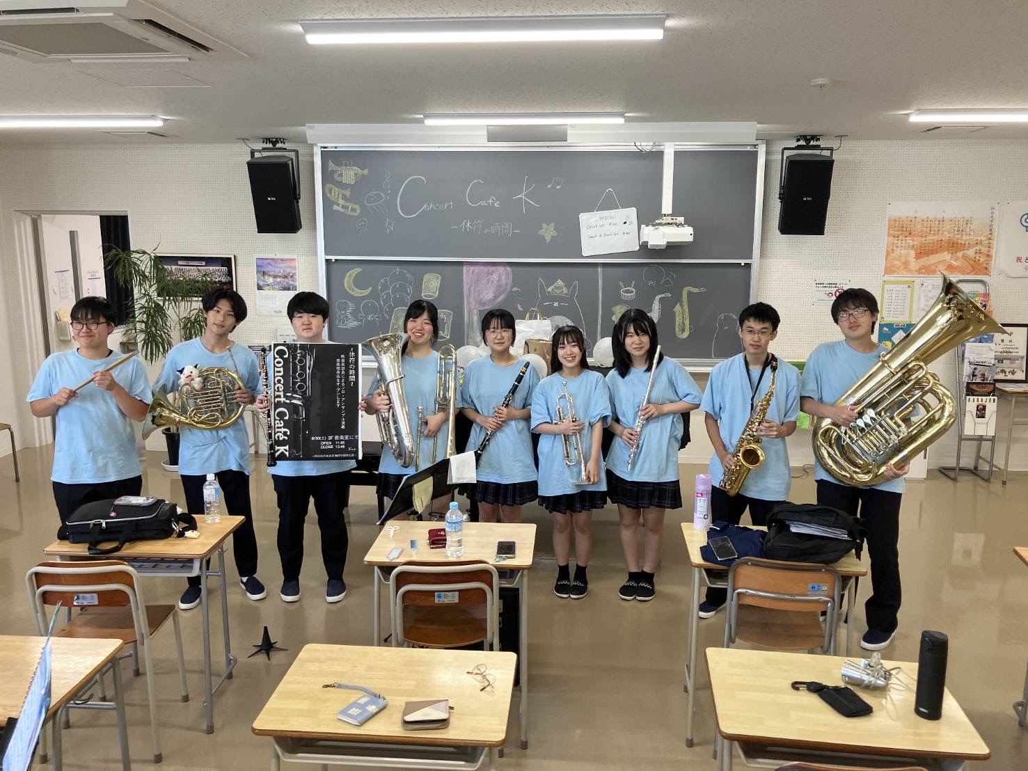 令和7年8月29日(金)~30日(土)の2日間、学園祭が開催されました。吹奏楽部では、アリーナ(新体育館)でのポップス曲演奏に加え、3階ミュージックスクエア(音楽室)での音楽喫茶店を開店(運営&演奏)しました。「学園天国」では、新妻先生の指揮のもと、全校生徒にかけ声で応援いただき、大変盛り上がりました。そのほか「GUTS!」「赤いスイートピー」「YOASOBIメドレー」を演奏しました。