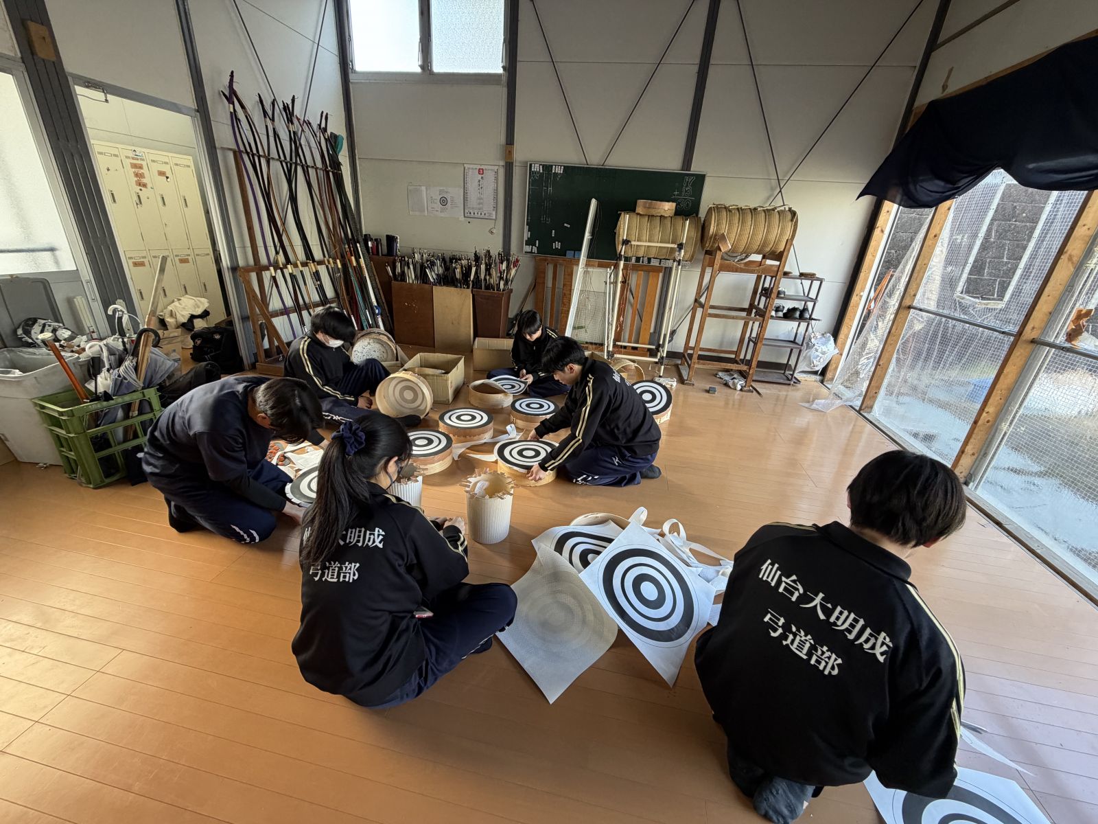 こちらは、ある日の弓道場です。まだまだ寒い日ですが黙々と的作りに勤しんでいます。