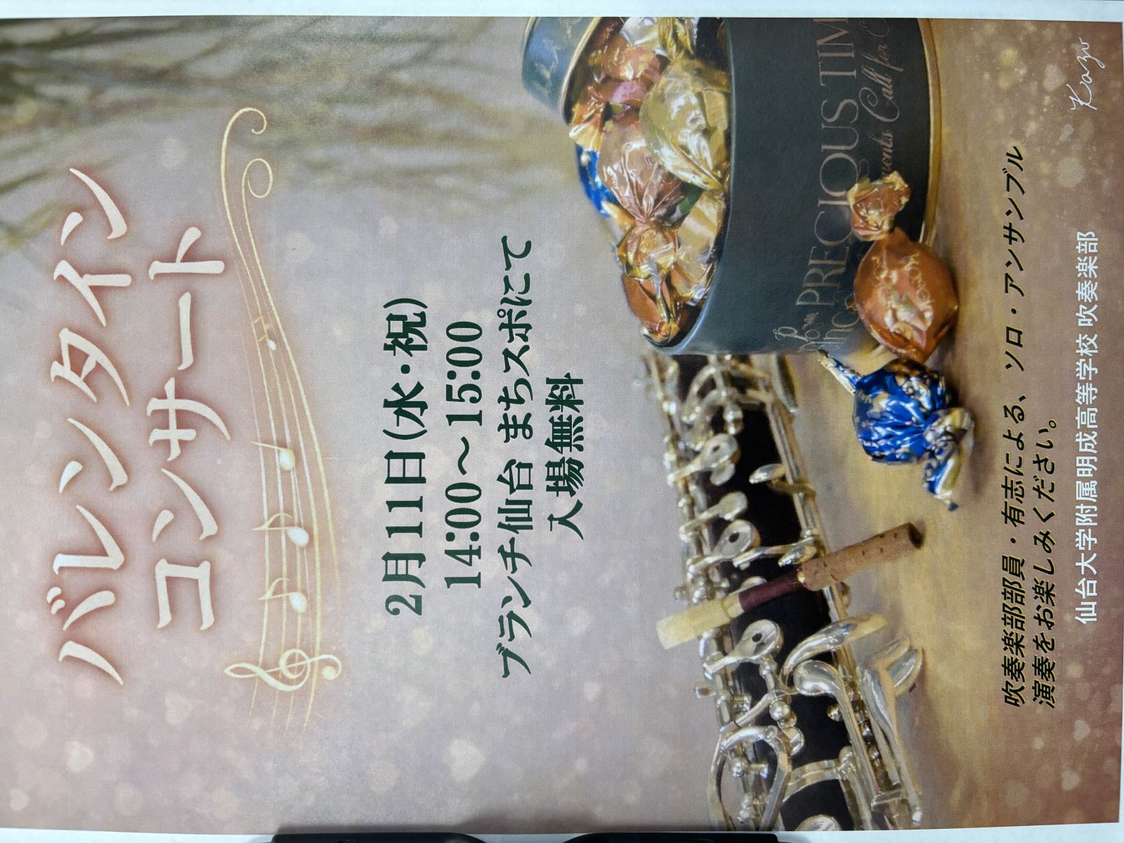 2/11(水・祝)に、学校近隣の商業施設内にて、ミニコンサートを開催します。「仙台大明成高校吹奏楽部 バレンタインコンサート」