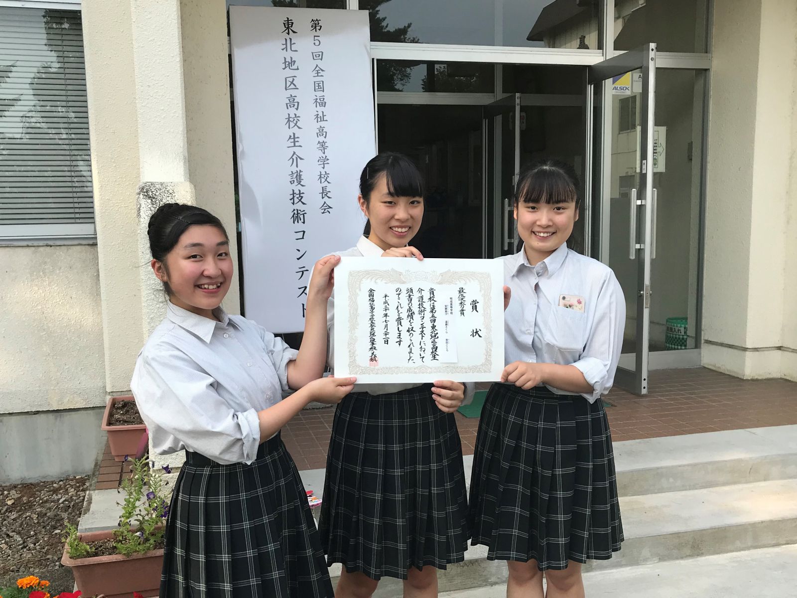 7/21(土)秋田県六郷高校にて開催された「東北地区高校生介護技術コンテスト」へ出場しました。 東北各地の福祉を学ぶ高校9校が出場し、見事『最優秀賞』を受賞。10/21(日)、山口市で開催される全国大会へ出場することになりました。 皆様の応援、ありがとうございました。全国大会も頑張ります。詳しくは「介護福祉科」のブログをご覧ください。